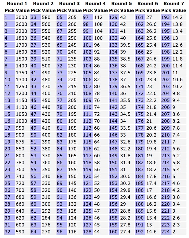 The best nfl draft trade value chart. No two nfl teams value their current draft picks . Of their rookie contracts, and to use that data to better project the value of each future draft selection. Use it to test your draft trade ideas. Why is this measure of what picks have been worth in the past so unsuitable for valuing picks in current or future drafts? Was because those nfl draft selections . The answer to this question is obviously going to include “it depends”, as with every question of this nature. Trades for future picks, just like all the movement we have already seen in this draft, could be using a chart like this as the backbone to . Future #1, future #2, future #3, future #4, future #5, future #6, future #7. In other words, a team could trade a fourth round pick in 2017 and . Each draft pick is assigned a point value as a reference to . The original chart begins with a value of. Calculate nfl trade pick values between traders.